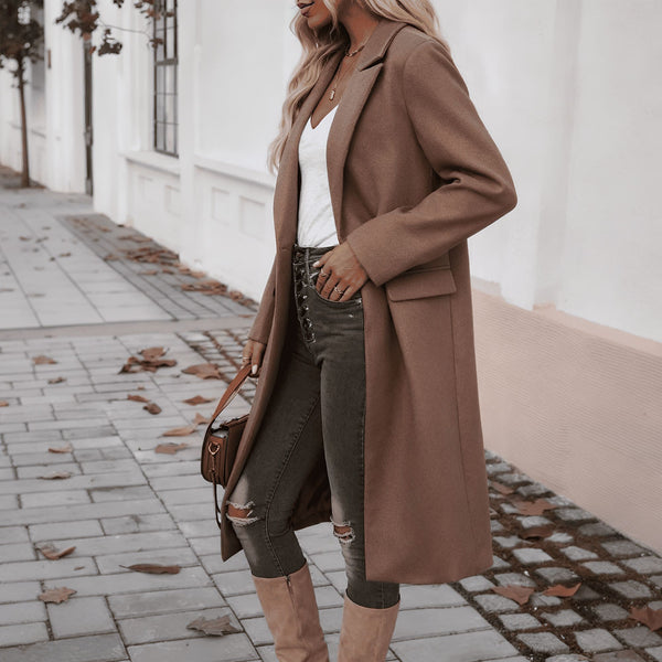 Płaszcz damski z wełnianej mieszanki | Długa kurtka z klapą