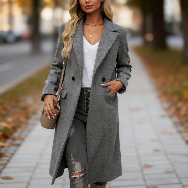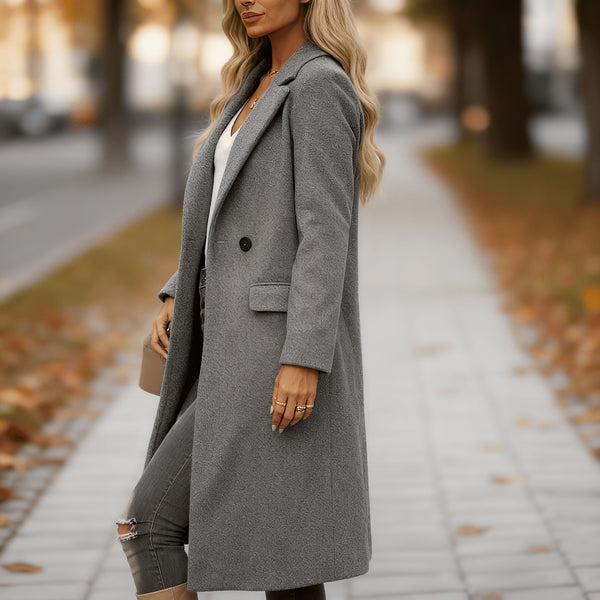 Ten długi płaszcz z wełnianej mieszanki to połączenie klasyki i nowoczesnej elegancji. Dwurzędowe zapięcie i szerokie klapy dodają mu szyku, a taliowany krój pięknie podkreśla sylwetkę. Dzięki ocieplającemu materiałowi z domieszką wełny oraz pełnej długości płaszcz zapewnia ciepło i komfort w chłodne dni. To idealny wybór na jesień i zimę – zarówno do pracy, jak i na wieczorne wyjścia.